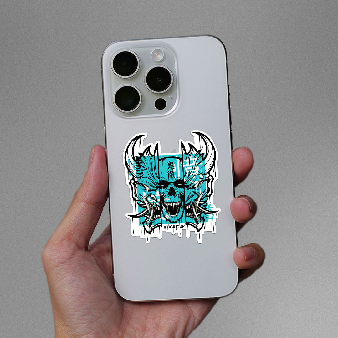Skull Oni Demon Mask Sticker vinyl sticker, waterproof durable collectible sticker for laptop, phone, bottle, bike, notebook, helmet, and accessories.