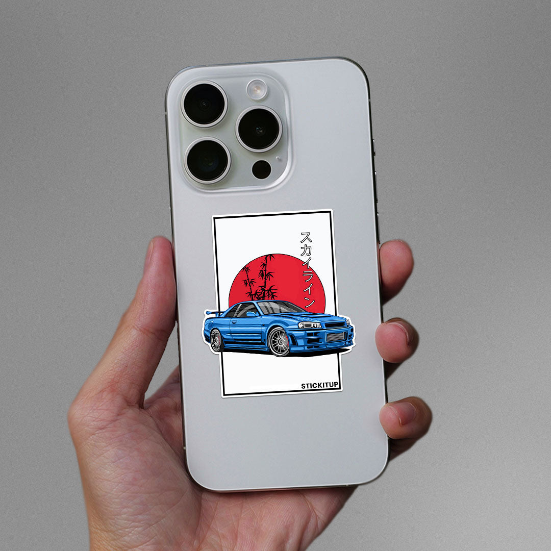 GTR R34 Sticker vinyl sticker, waterproof durable collectible sticker for laptop, phone, bottle, bike, notebook, helmet, and accessories.