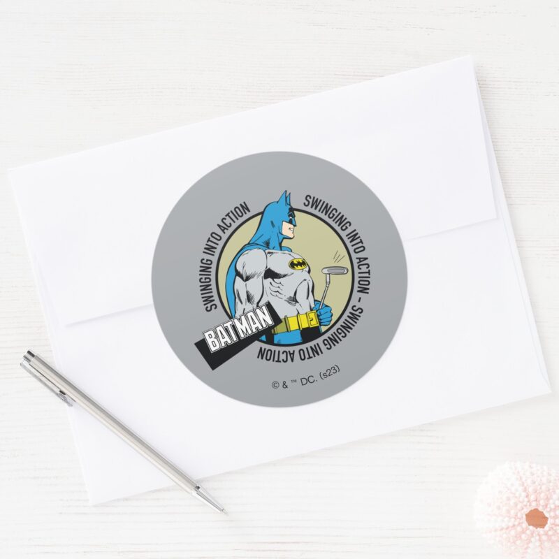 Batman Golfing Swinging Into Action Classic Round Sticker vinyl sticker, waterproof durable collectible sticker for laptop, phone, bottle, bike, notebook, helmet, and accessories.