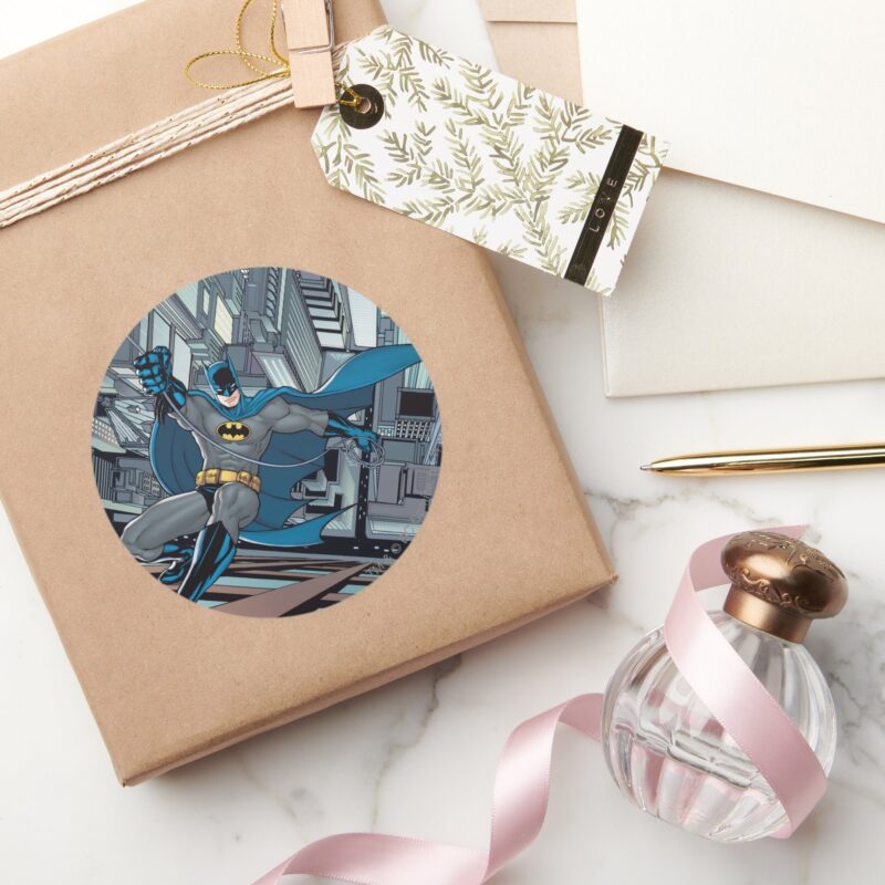 Batman Scenes Scaling Wall Classic Round Sticker vinyl sticker, waterproof durable collectible sticker for laptop, phone, bottle, bike, notebook, helmet, and accessories.