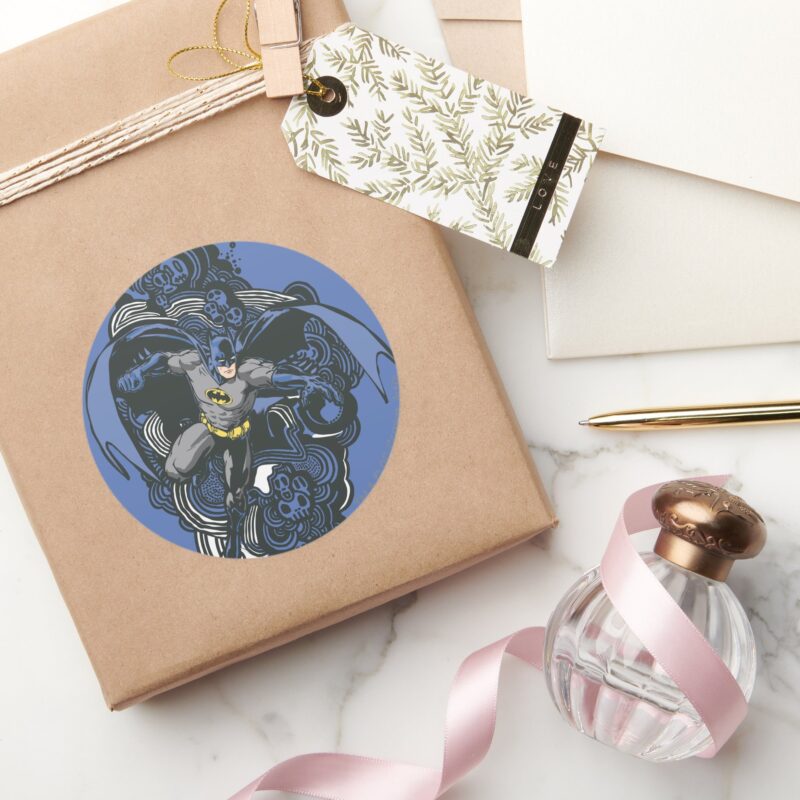 Batman Skulls Ink Doodle 2 Classic Round Sticker vinyl sticker, waterproof durable collectible sticker for laptop, phone, bottle, bike, notebook, helmet, and accessories.