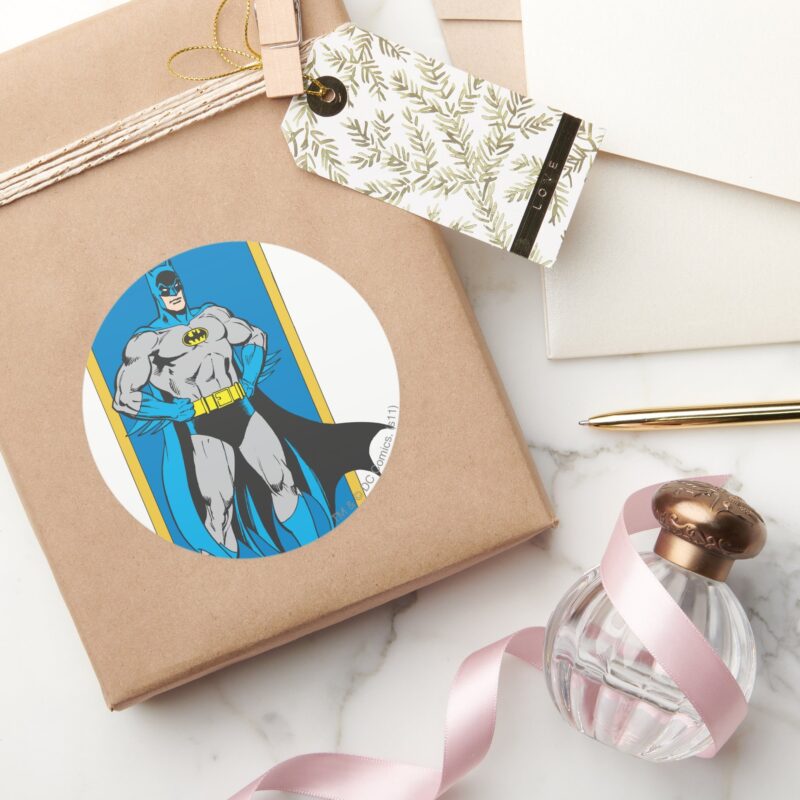 Batman Stands 2 Classic Round Sticker vinyl sticker, waterproof durable collectible sticker for laptop, phone, bottle, bike, notebook, helmet, and accessories.