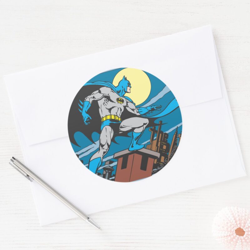 Batman Surveys City Classic Round Sticker vinyl sticker, waterproof durable collectible sticker for laptop, phone, bottle, bike, notebook, helmet, and accessories.