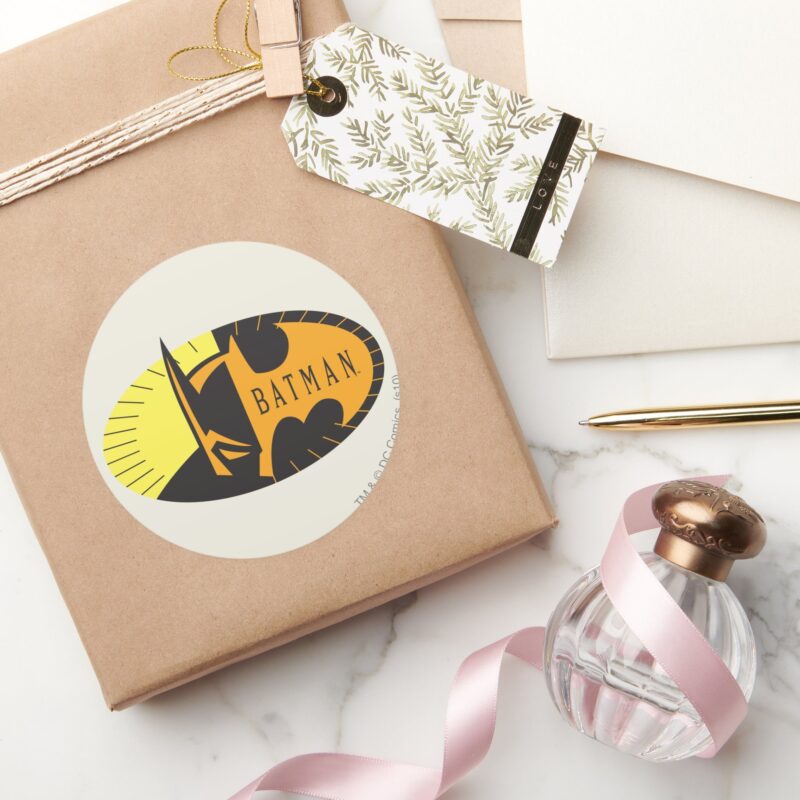 Batman Symbol Silhouette Logo Classic Round Sticker vinyl sticker, waterproof durable collectible sticker for laptop, phone, bottle, bike, notebook, helmet, and accessories.