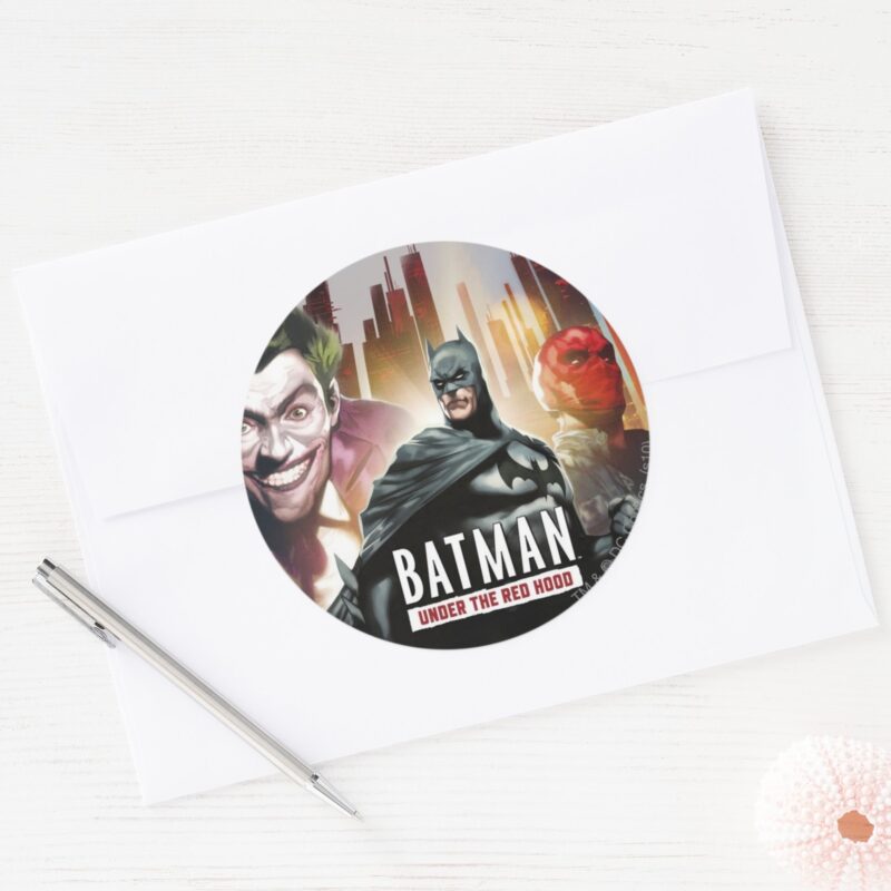 Batman Under The Red Hood Classic Round Sticker vinyl sticker, waterproof durable collectible sticker for laptop, phone, bottle, bike, notebook, helmet, and accessories.
