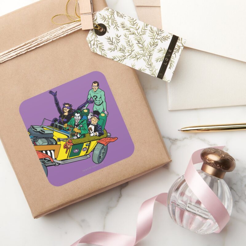 Batman Villains In Jokermobile Square Sticker vinyl sticker, waterproof durable collectible sticker for laptop, phone, bottle, bike, notebook, helmet, and accessories.