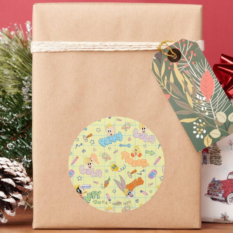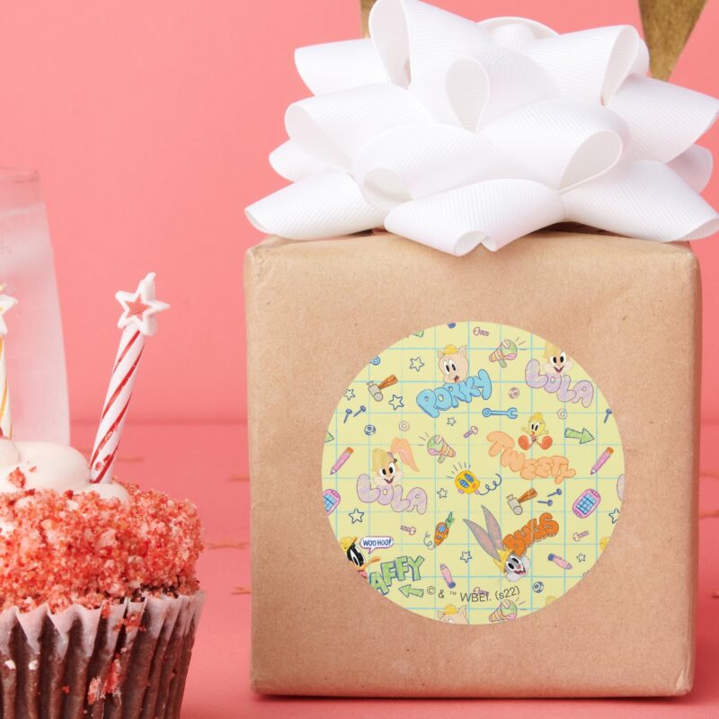 BUGS BUNNY BUILDERS™ Character Sketch Pattern Classic Round Sticker vinyl sticker, waterproof durable collectible sticker for laptop, phone, bottle, bike, notebook, helmet, and accessories.