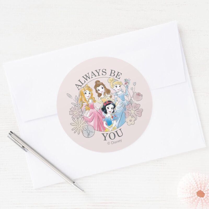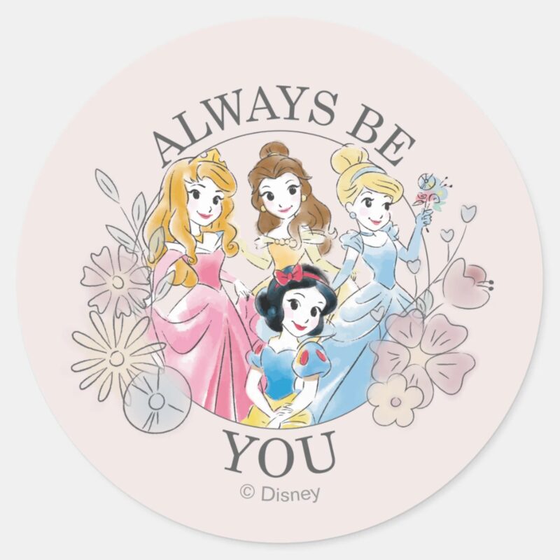 Disney Princess Always Be You Classic Round Sticker vinyl sticker, waterproof durable collectible sticker for laptop, phone, bottle, bike, notebook, helmet, and accessories.