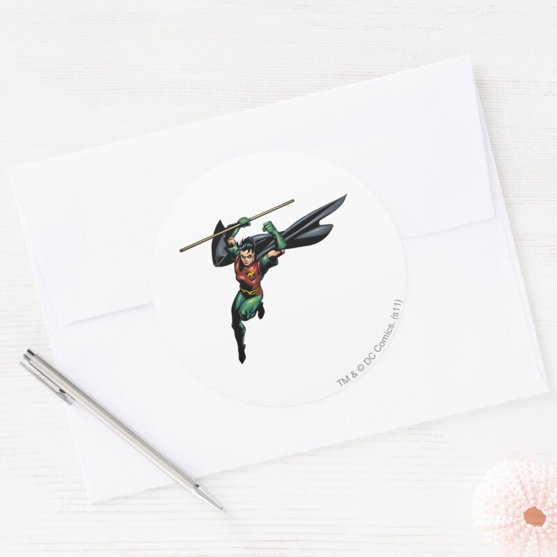 Robin With Staff Leaps Classic Round Sticker vinyl sticker, waterproof durable collectible sticker for laptop, phone, bottle, bike, notebook, helmet, and accessories.
