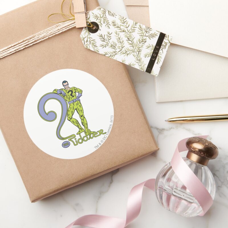 The Riddler Logo Green Classic Round Sticker vinyl sticker, waterproof durable collectible sticker for laptop, phone, bottle, bike, notebook, helmet, and accessories.