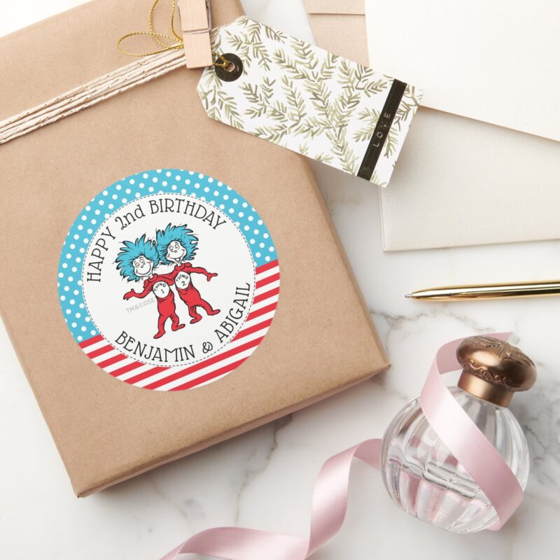Thing One Thing Two Twins Birthday Classic Round Sticker vinyl sticker, waterproof durable collectible sticker for laptop, phone, bottle, bike, notebook, helmet, and accessories.