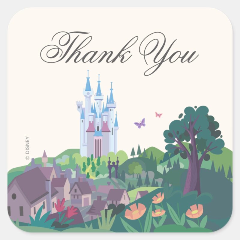Whimsical Cinderella Castle Birthday Thank You Square Sticker vinyl sticker, waterproof durable collectible sticker for laptop, phone, bottle, bike, notebook, helmet, and accessories.