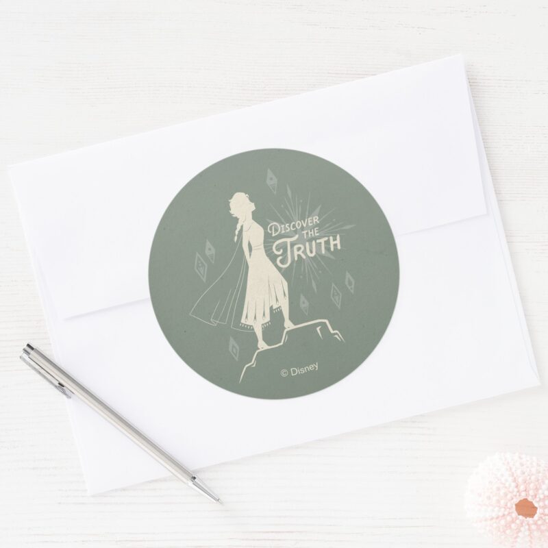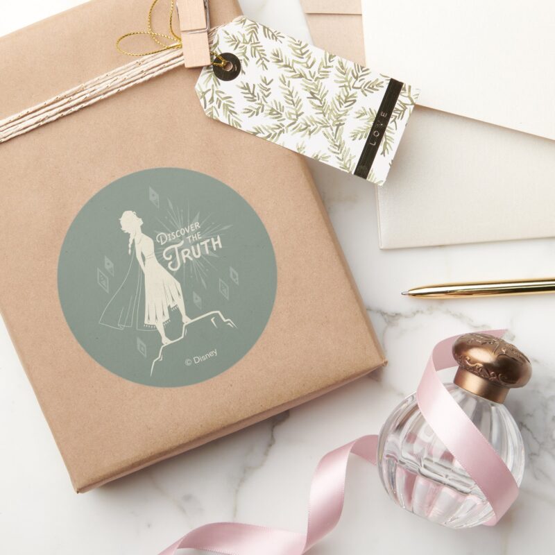 Frozen 2 Elsa Discover The Truth Classic Round Sticker vinyl sticker, waterproof durable collectible sticker for laptop, phone, bottle, bike, notebook, helmet, and accessories.