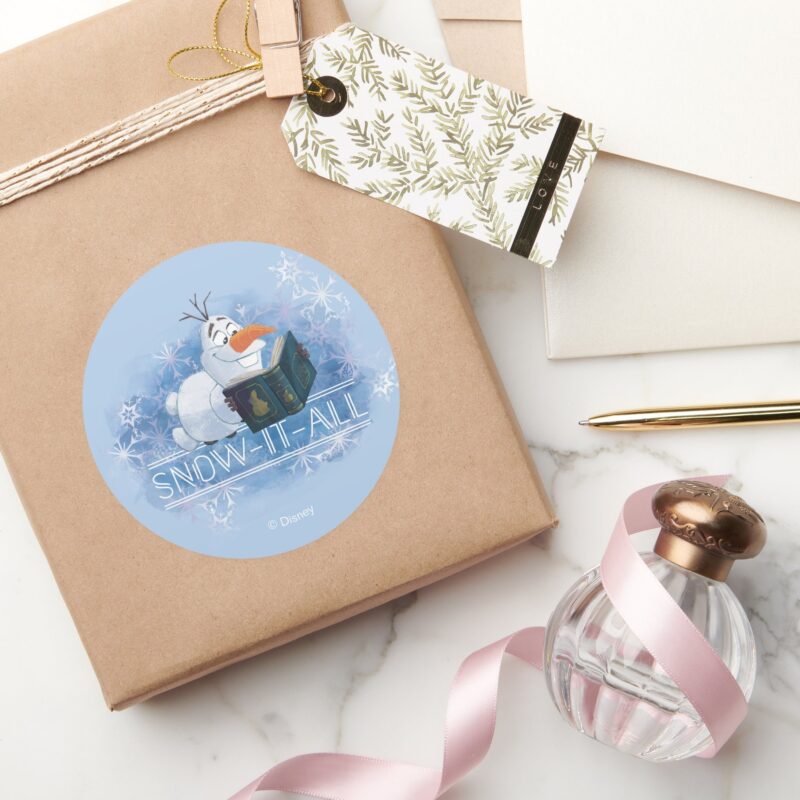 Frozen 2 Olaf Snow It All Classic Round Sticker vinyl sticker, waterproof durable collectible sticker for laptop, phone, bottle, bike, notebook, helmet, and accessories.