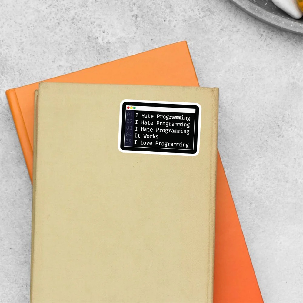 I Hate Programming It Works I Love Programming Witty Stickers vinyl sticker, waterproof durable collectible sticker for laptop, phone, bottle, bike, notebook, helmet, and accessories.