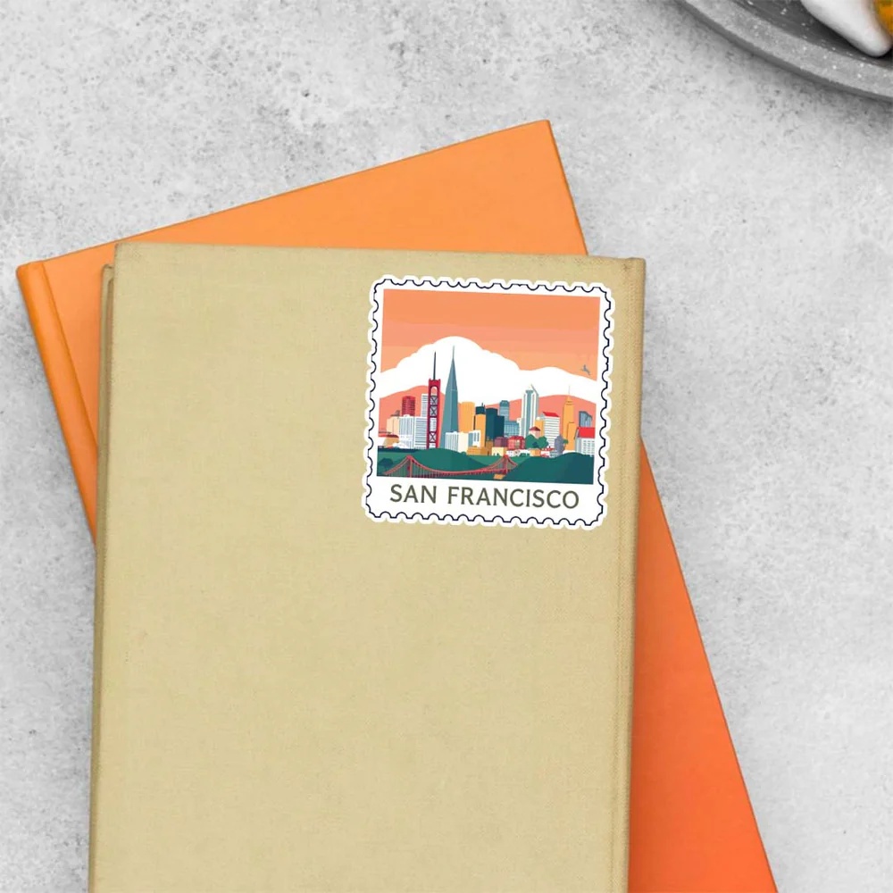 San Francisco Golden Gate Sunset Post Stamp Travels Stickers vinyl sticker, waterproof durable collectible sticker for laptop, phone, bottle, bike, notebook, helmet, and accessories.
