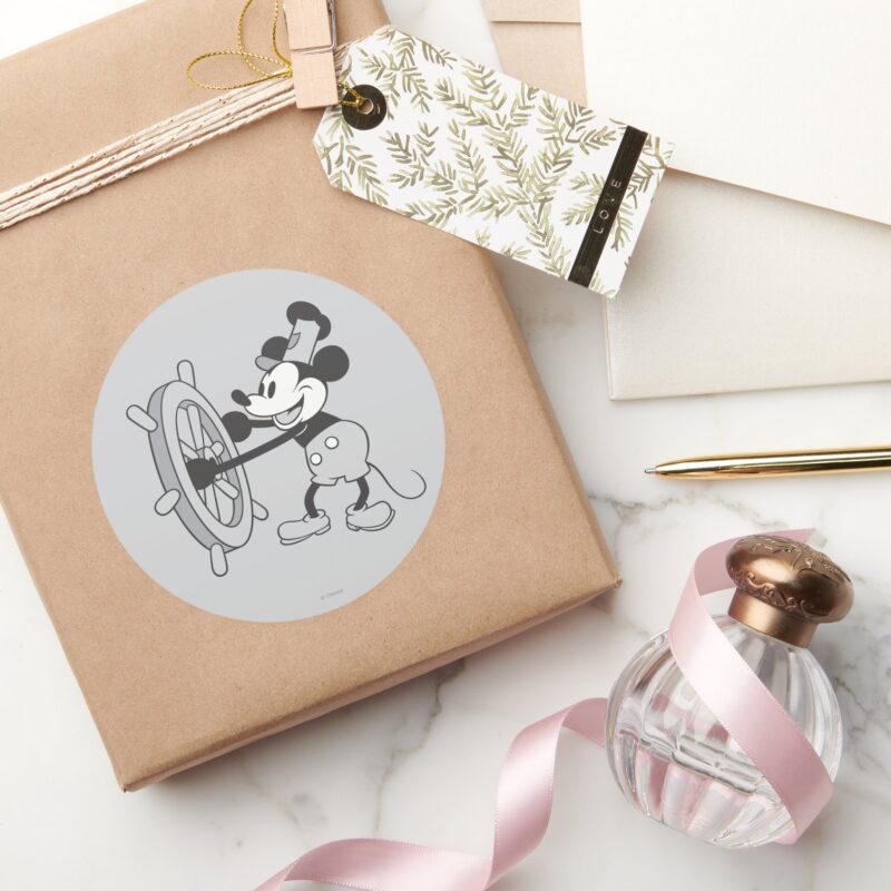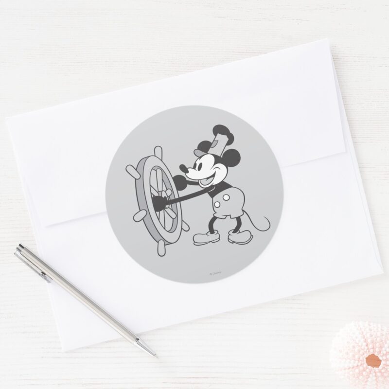 Classic Mickey Steamboat Willie Classic Round Sticker vinyl sticker, waterproof durable collectible sticker for laptop, phone, bottle, bike, notebook, helmet, and accessories.