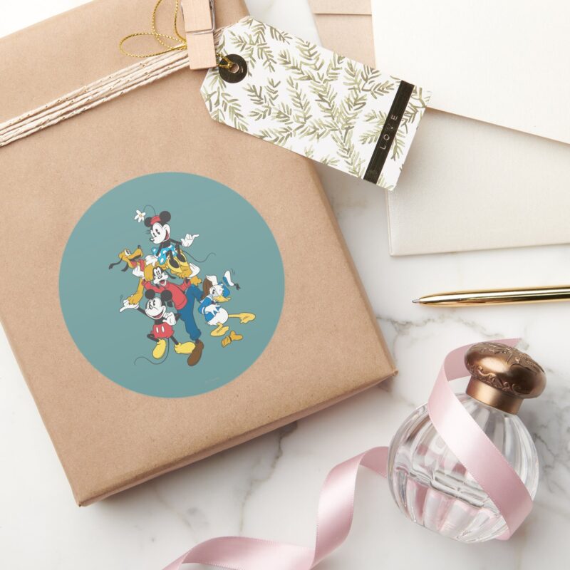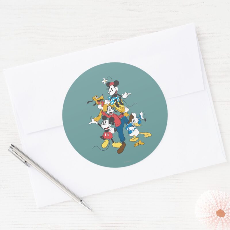 Mickey Friends Classic Group Classic Round Sticker vinyl sticker, waterproof durable collectible sticker for laptop, phone, bottle, bike, notebook, helmet, and accessories.