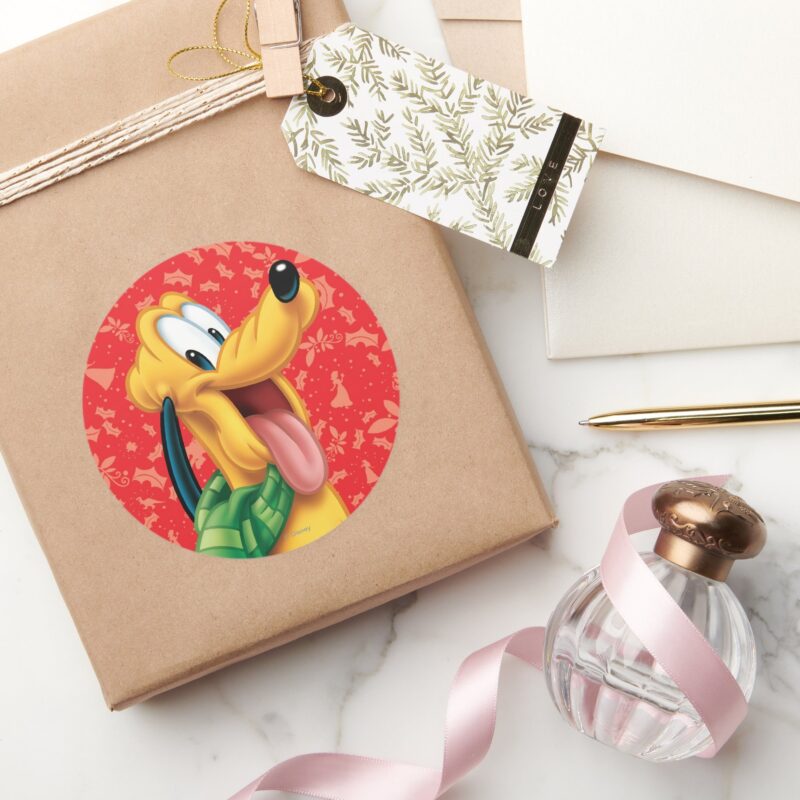 Pluto In Scarf Classic Round Sticker vinyl sticker, waterproof durable collectible sticker for laptop, phone, bottle, bike, notebook, helmet, and accessories.