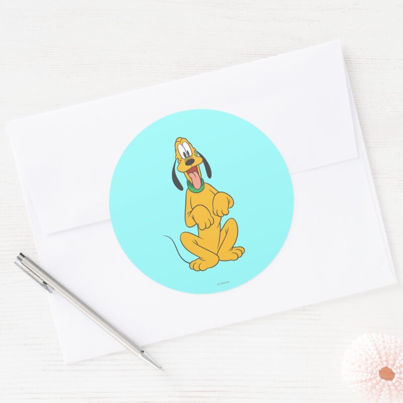 Pluto Paws Up Classic Round Sticker vinyl sticker, waterproof durable collectible sticker for laptop, phone, bottle, bike, notebook, helmet, and accessories.