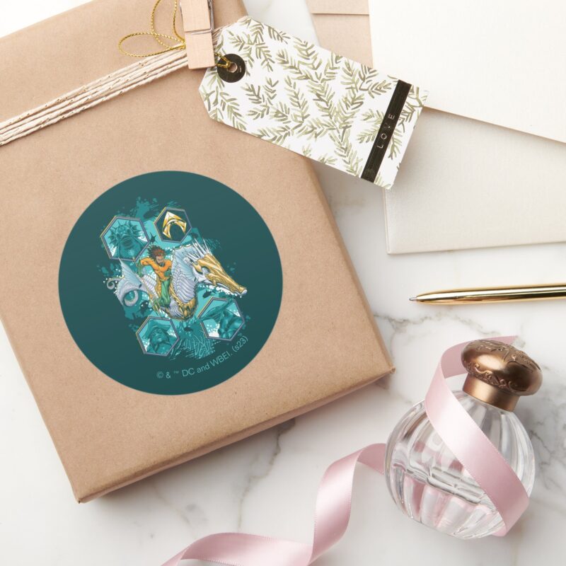 Aquaman Riding Seahorse Across Kingdoms Classic Round Sticker vinyl sticker, waterproof durable collectible sticker for laptop, phone, bottle, bike, notebook, helmet, and accessories.