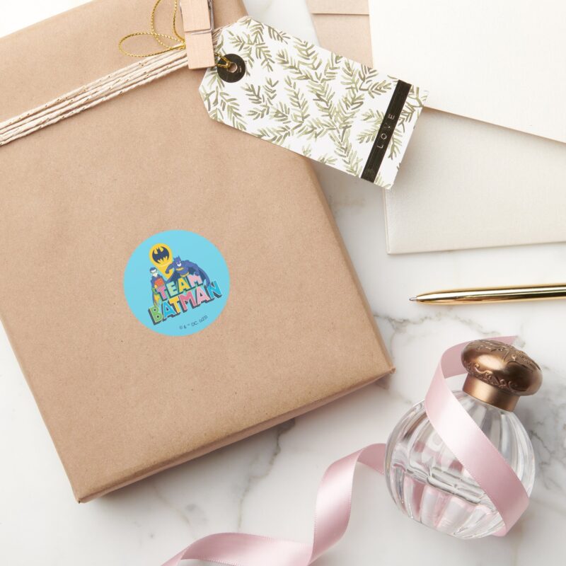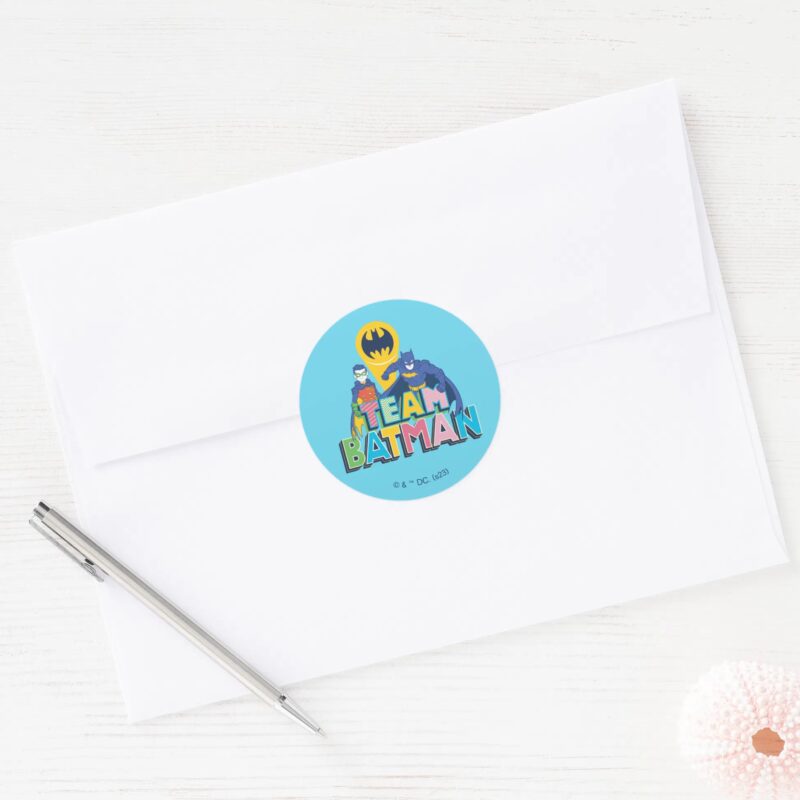 Batman Team Batman Classic Round Sticker vinyl sticker, waterproof durable collectible sticker for laptop, phone, bottle, bike, notebook, helmet, and accessories.
