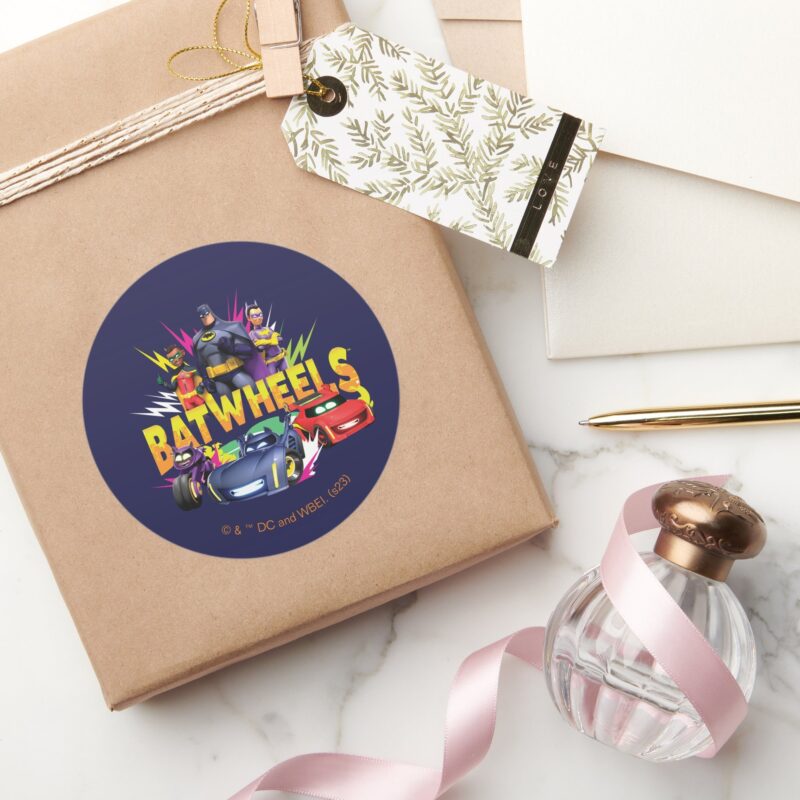 Batwheels™ Superhero Team Classic Round Sticker vinyl sticker, waterproof durable collectible sticker for laptop, phone, bottle, bike, notebook, helmet, and accessories.