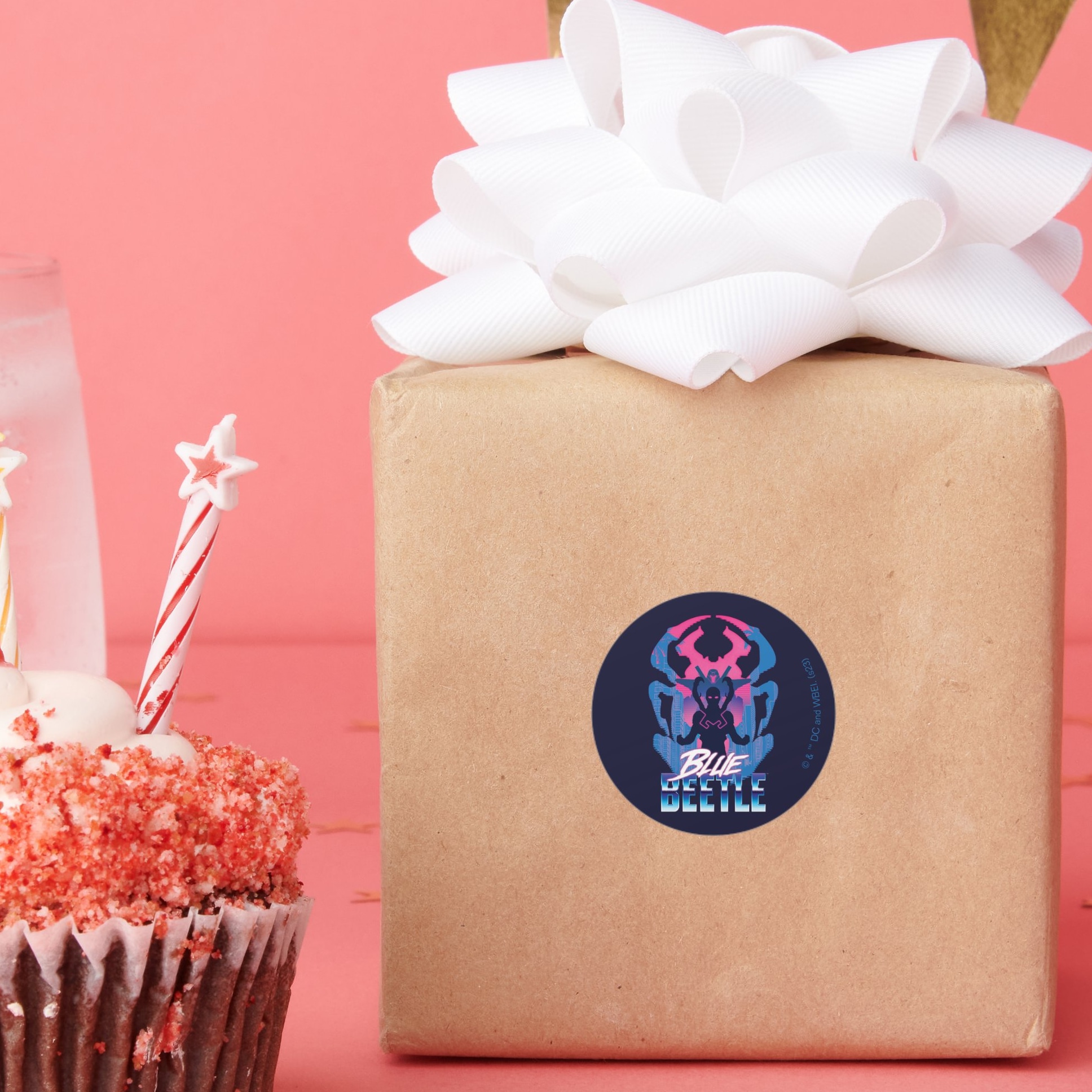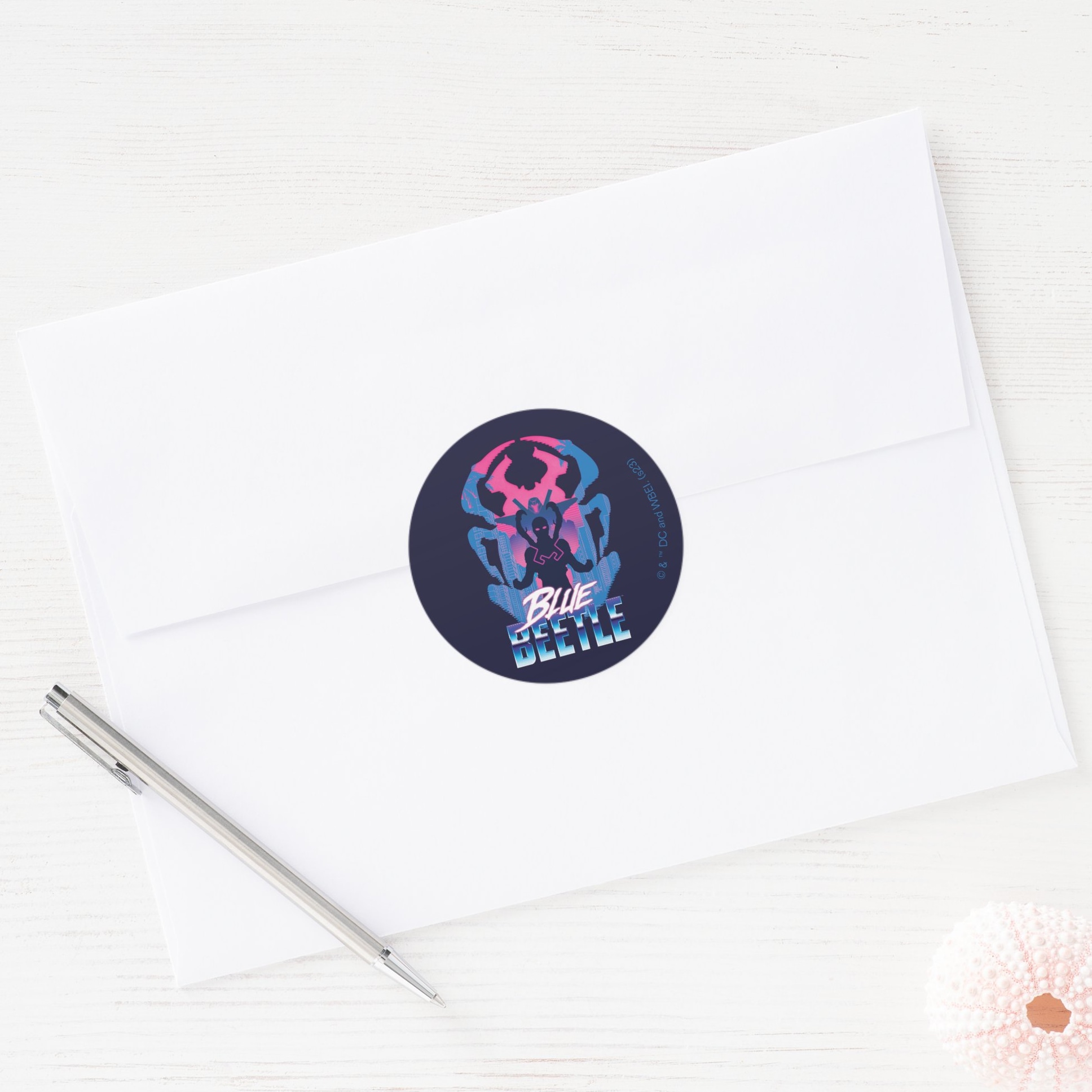 Blue Beetle Retrowave Versus Graphic Classic Round Sticker vinyl sticker, waterproof durable collectible sticker for laptop, phone, bottle, bike, notebook, helmet, and accessories.