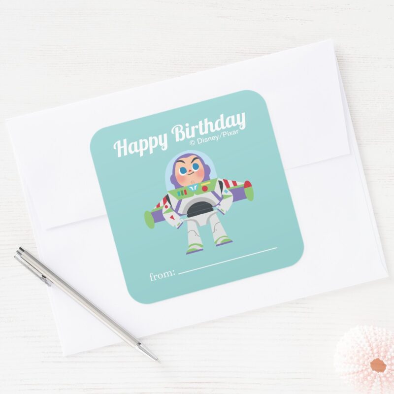 Buzz Lightyear A Gift From Birthday Square Sticker vinyl sticker, waterproof durable collectible sticker for laptop, phone, bottle, bike, notebook, helmet, and accessories.
