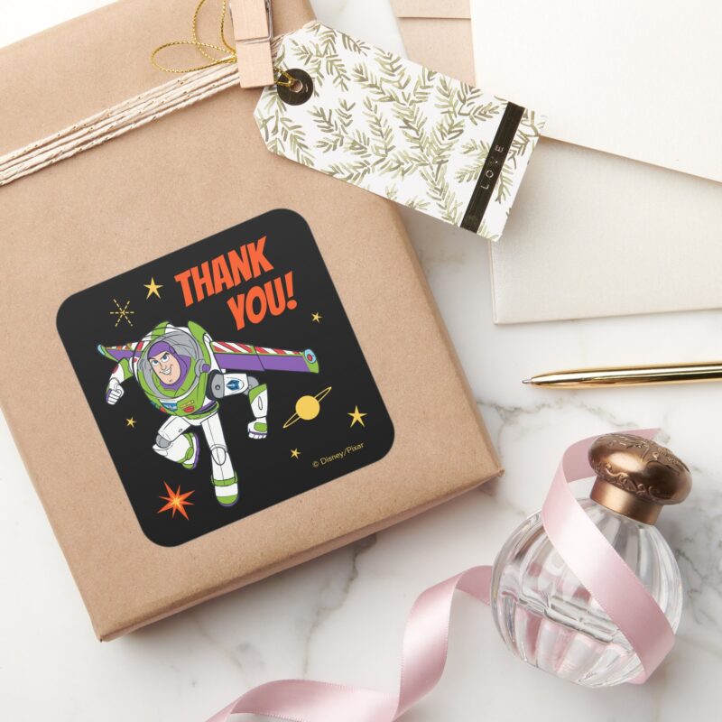Buzz Lightyear Birthday Thank You Square Sticker vinyl sticker, waterproof durable collectible sticker for laptop, phone, bottle, bike, notebook, helmet, and accessories.
