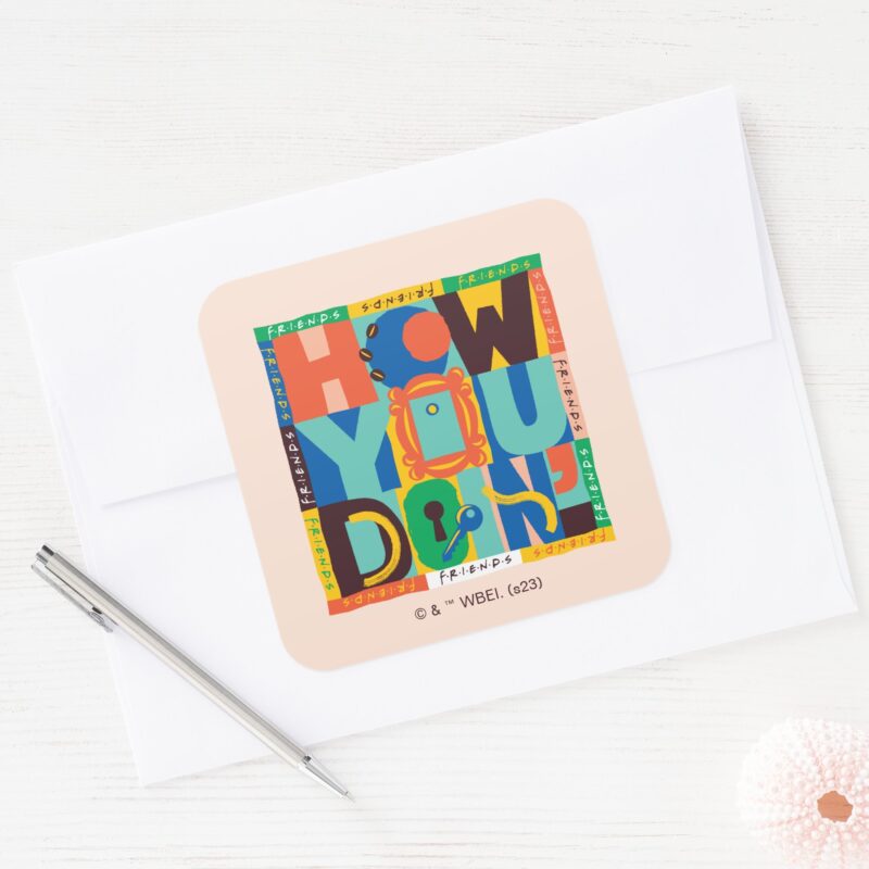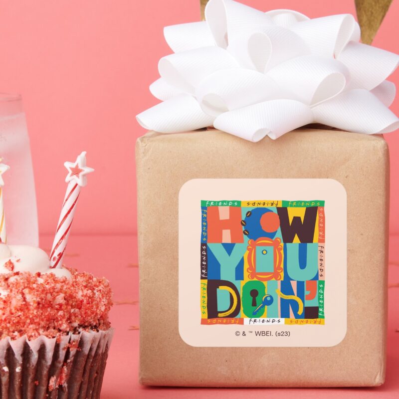 FRIENDS™ How You Doin Vibrant Graphic Square Sticker vinyl sticker, waterproof durable collectible sticker for laptop, phone, bottle, bike, notebook, helmet, and accessories.