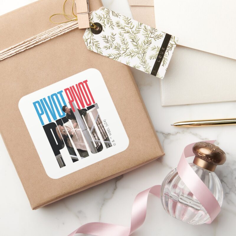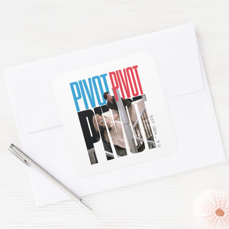 FRIENDS™ PIVOT PIVOT PIVOT Quote Square Sticker vinyl sticker, waterproof durable collectible sticker for laptop, phone, bottle, bike, notebook, helmet, and accessories.