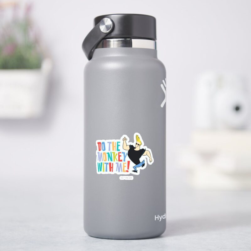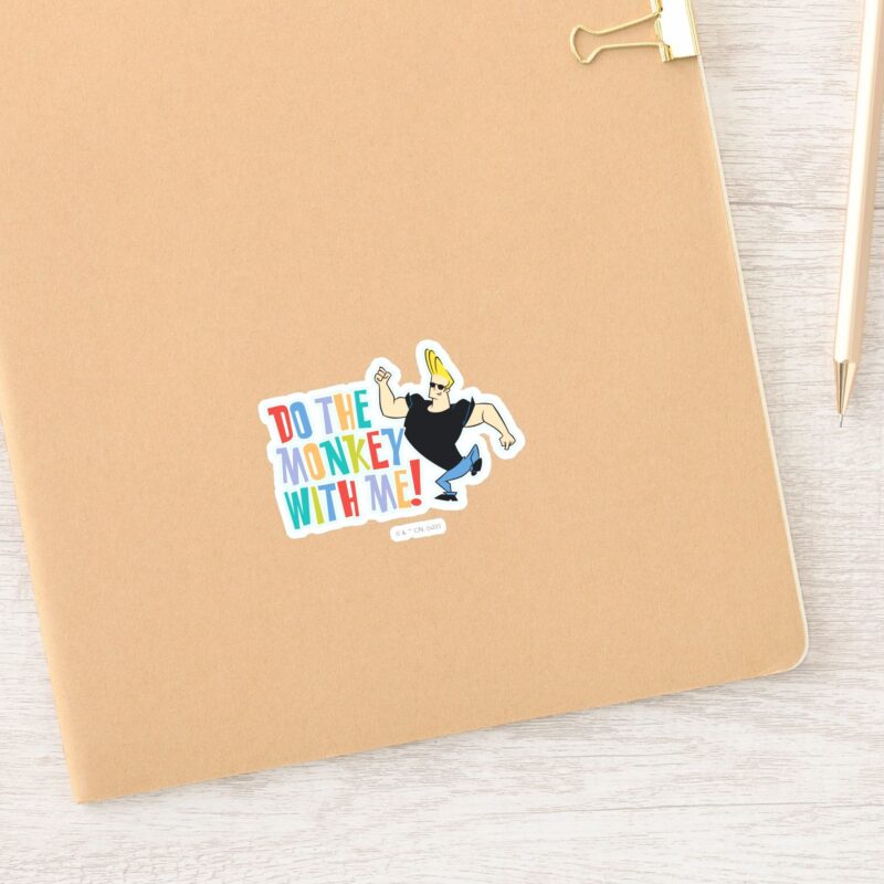 Johnny Bravo Do The Monkey With Me Sticker vinyl sticker, waterproof durable collectible sticker for laptop, phone, bottle, bike, notebook, helmet, and accessories.