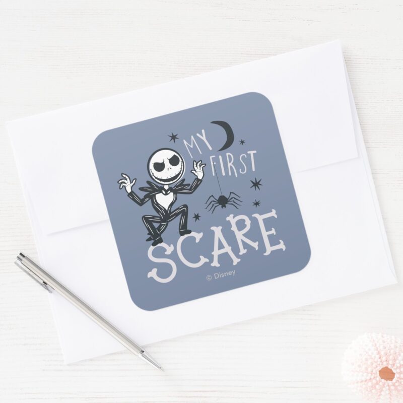 Little Jack Skellington My First Scare Square Sticker vinyl sticker, waterproof durable collectible sticker for laptop, phone, bottle, bike, notebook, helmet, and accessories.