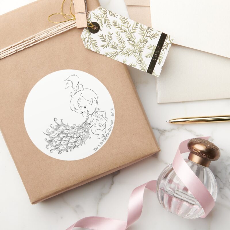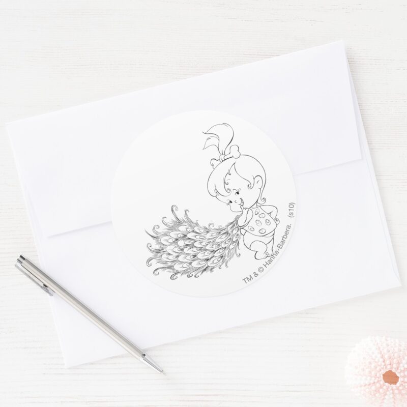 PEBBLES™ In Peacock Classic Round Sticker vinyl sticker, waterproof durable collectible sticker for laptop, phone, bottle, bike, notebook, helmet, and accessories.