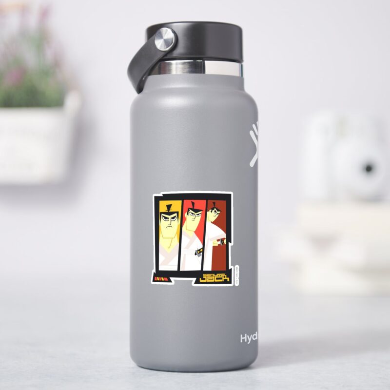 Samurai Jack Character Tri Panel Futuristic Frame Sticker vinyl sticker, waterproof durable collectible sticker for laptop, phone, bottle, bike, notebook, helmet, and accessories.