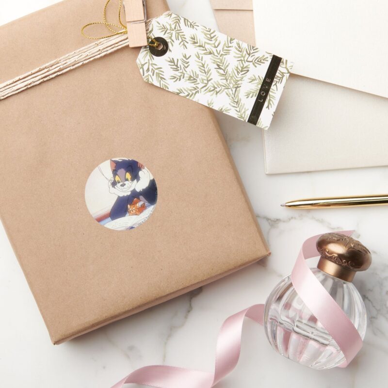 Tom And Jerry Read A Book Classic Round Sticker vinyl sticker, waterproof durable collectible sticker for laptop, phone, bottle, bike, notebook, helmet, and accessories.