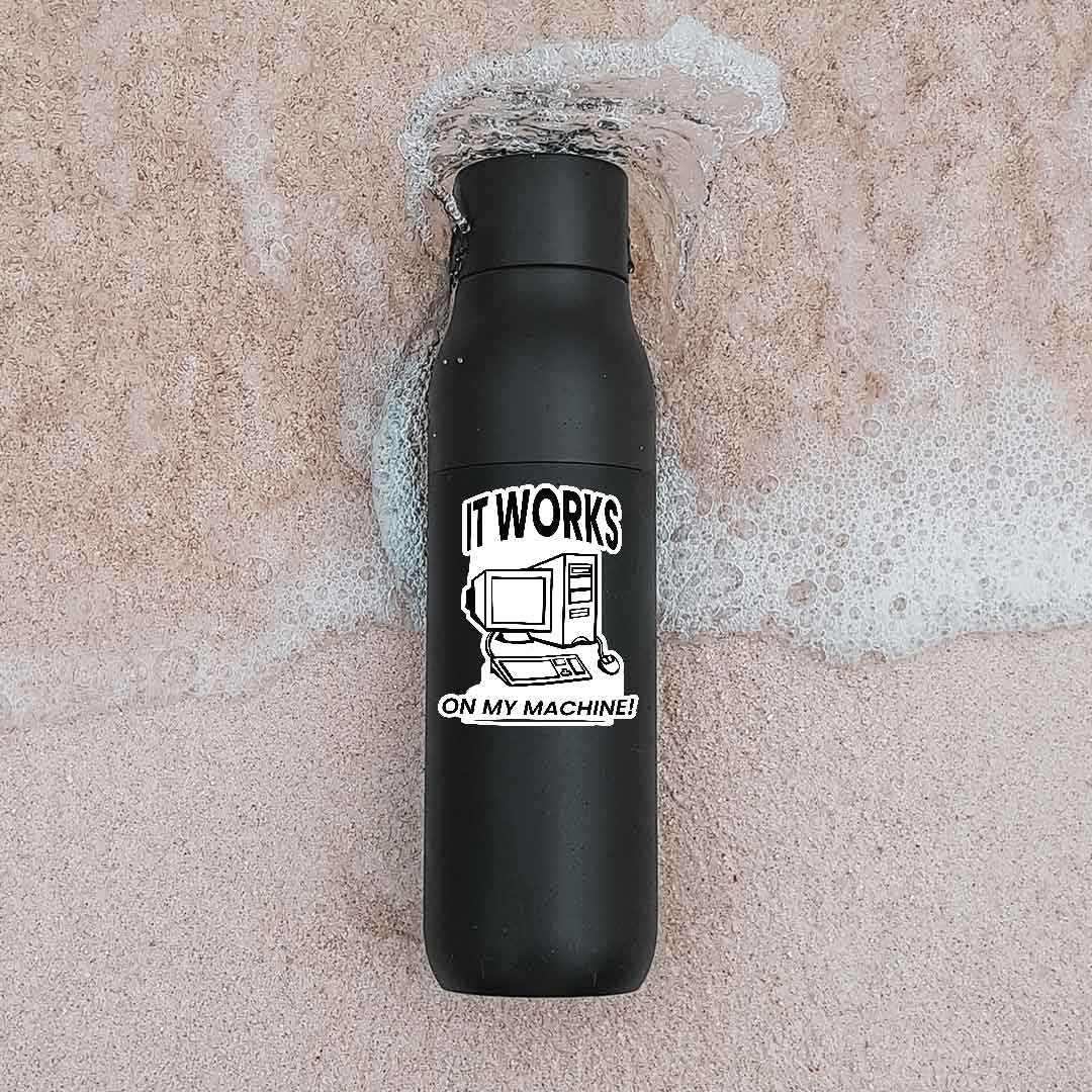 It Works On My Machine Sticker vinyl sticker, waterproof durable collectible sticker for laptop, phone, bottle, bike, notebook, helmet, and accessories.