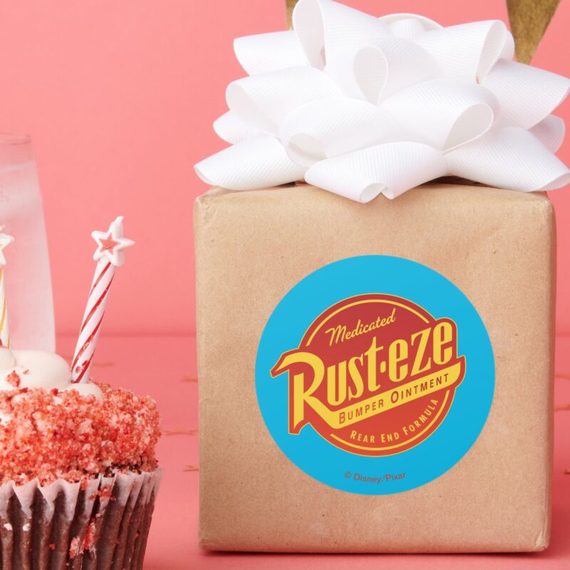 Cars 3 Rust Eze Logo Classic Round Sticker vinyl sticker, waterproof durable collectible sticker for laptop, phone, bottle, bike, notebook, helmet, and accessories.