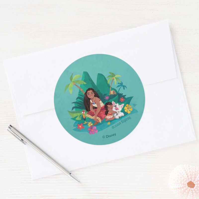 Moana And Simea Ocean Sisters Classic Round Sticker vinyl sticker, waterproof durable collectible sticker for laptop, phone, bottle, bike, notebook, helmet, and accessories.