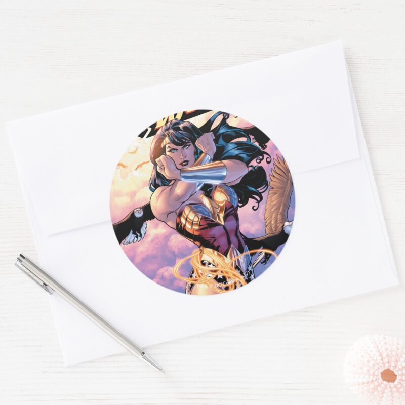 Wonder Woman Comic Cover 1 Classic Round Sticker vinyl sticker, waterproof durable collectible sticker for laptop, phone, bottle, bike, notebook, helmet, and accessories.