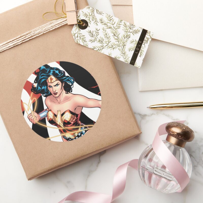 Wonder Woman Comic Cover 12 Classic Round Sticker vinyl sticker, waterproof durable collectible sticker for laptop, phone, bottle, bike, notebook, helmet, and accessories.