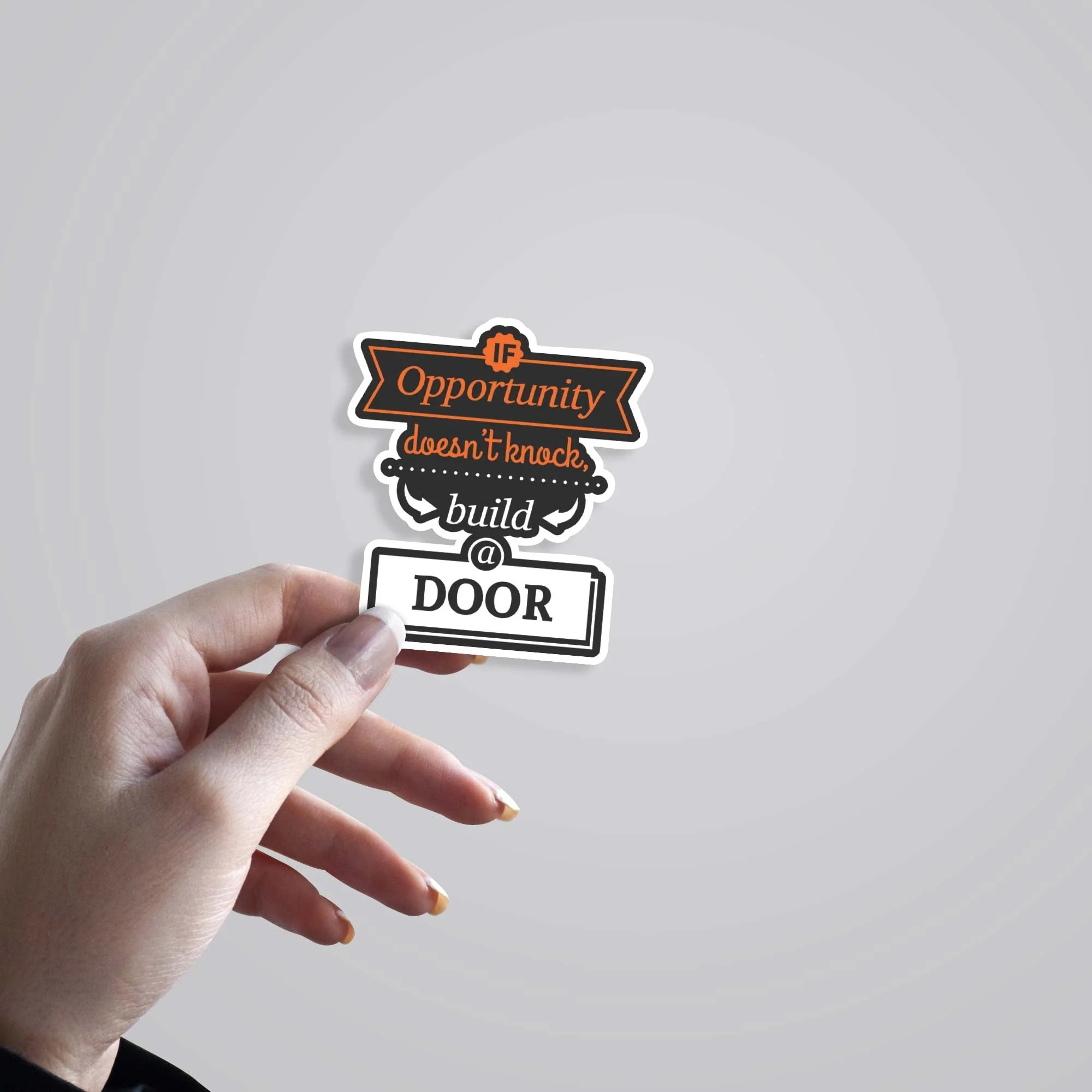 Opportunity Doesnt Knock Motivational Stickers vinyl sticker, waterproof durable collectible sticker for laptop, phone, bottle, bike, notebook, helmet, and accessories.