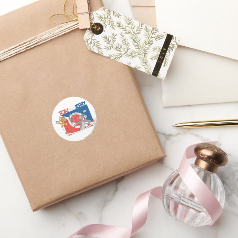 Tom And Jerry Tennis Stars 4 Classic Round Sticker vinyl sticker, waterproof durable collectible sticker for laptop, phone, bottle, bike, notebook, helmet, and accessories.