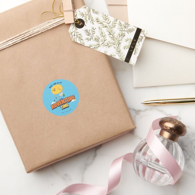 Adventure Time Jake Floating With Finn Classic Round Sticker vinyl sticker, waterproof durable collectible sticker for laptop, phone, bottle, bike, notebook, helmet, and accessories.