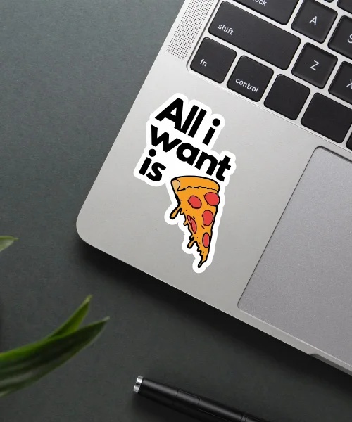 All I Want Is Pizza vinyl sticker, waterproof durable collectible sticker for laptop, phone, bottle, bike, notebook, helmet, and accessories.