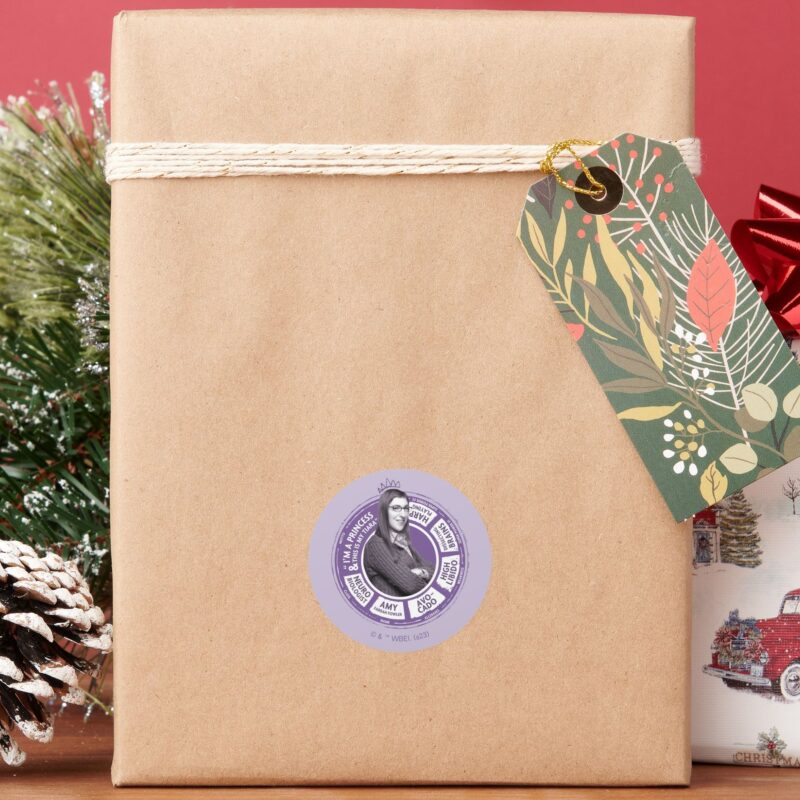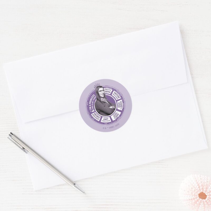 Amy Farrah Fowler Info Graphic Classic Round Sticker vinyl sticker, waterproof durable collectible sticker for laptop, phone, bottle, bike, notebook, helmet, and accessories.
