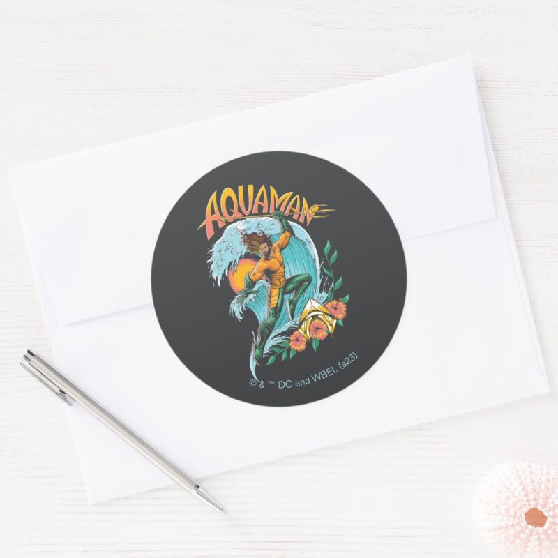 Aquaman And Trident Rising Surf Graphic Classic Round Sticker vinyl sticker, waterproof durable collectible sticker for laptop, phone, bottle, bike, notebook, helmet, and accessories.