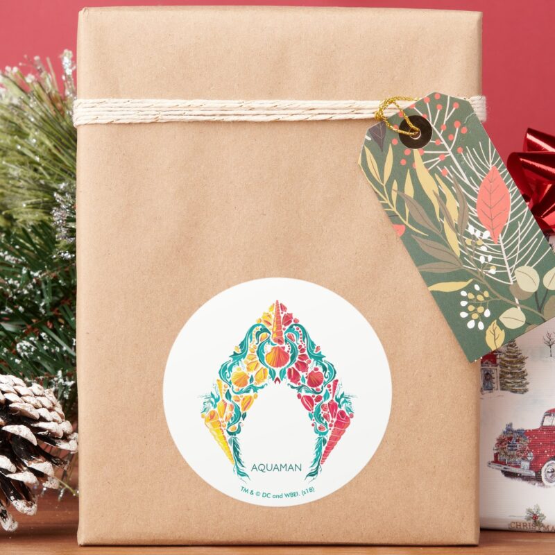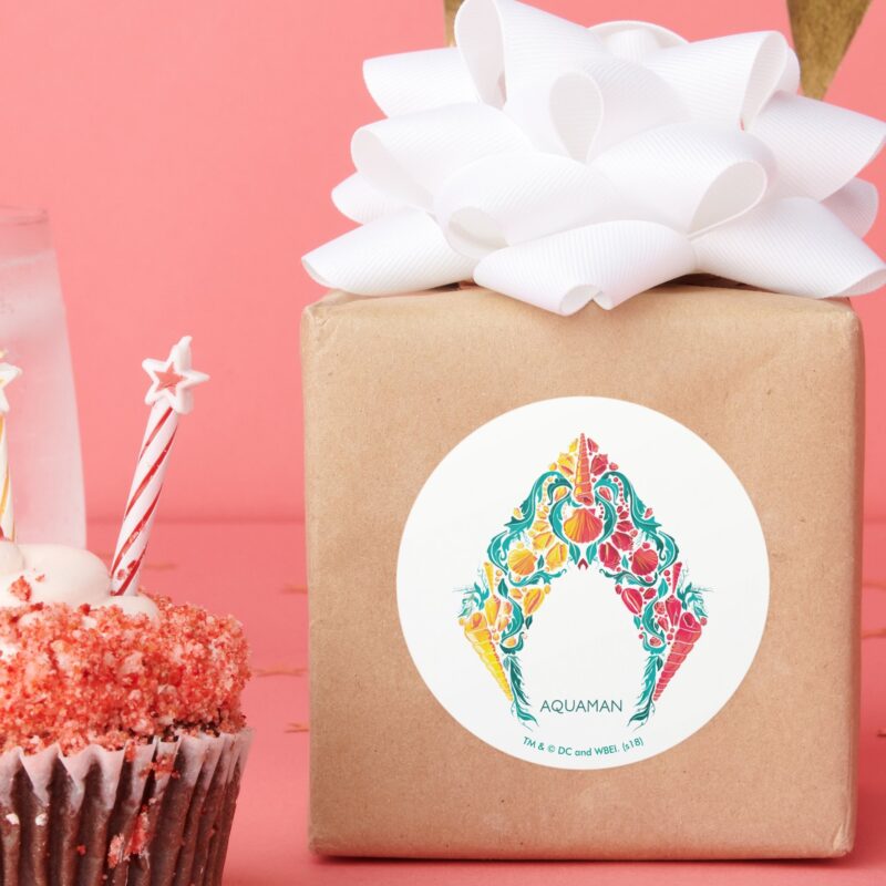 Aquaman Aquaman Mera Themed Seashell Logo Classic Round Sticker vinyl sticker, waterproof durable collectible sticker for laptop, phone, bottle, bike, notebook, helmet, and accessories.