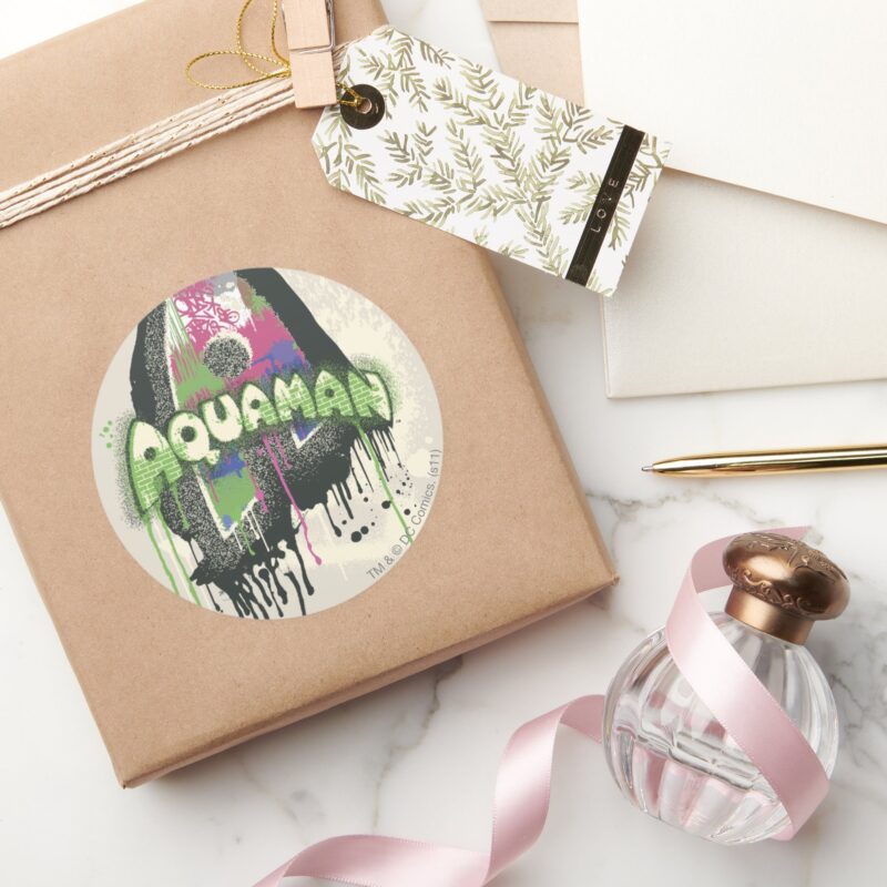 Aquaman Twisted Innocence Letter Classic Round Sticker vinyl sticker, waterproof durable collectible sticker for laptop, phone, bottle, bike, notebook, helmet, and accessories.